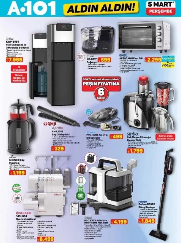Türkiye’nin perakende devi A101, 5 Mart kataloğuyla ev ekonomisine destek olmaya devam ediyor. Yeni haftada teknoloji grubunda Nordmende ve Onvo markalı akıllı televizyonlar ön plana çıkarken; ulaşım maliyetlerini düşürmek isteyenler için benzinli motosiklet seçenekleri katalogdaki yerini aldı. Ayrıca, evde üretim yapmak isteyenler için Singer overlok makinesi ve temizlikte profesyonel çözüm arayanlar için Kiwi koltuk yıkama makinesi gibi fonksiyonel ürünler, cazip taksit seçenekleriyle tüketicinin beğenisine sunuluyor.