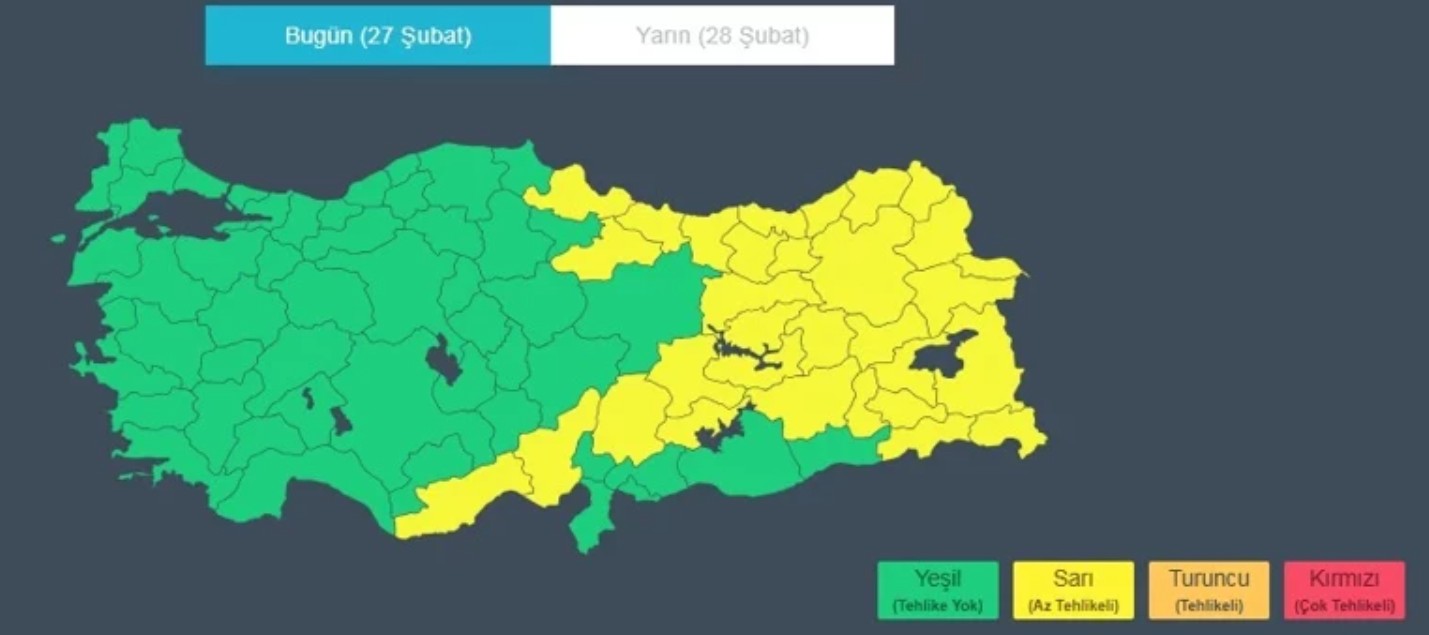Meteoroloji Genel Müdürlüğü, aralarında Adana, Mersin ve Trabzon’un da bulunduğu 31 il için sarı kodlu uyarı yayımladı. Doğu Karadeniz ve Doğu Anadolu’nun dik yamaçlarında çığ tehlikesi bulunduğunu hatırlatan uzmanlar, Akdeniz ve İç Anadolu’nun güneyinde ise saatte 70 km hıza ulaşabilecek fırtınaya karşı vatandaşları uyardı.