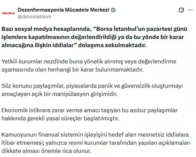 Borsada “Kapanış” iddialarına son nokta: DMM, Borsa İstanbul’un 2 Mart Pazartesi günü işlemlere kapatılacağına dair sosyal medyada dolaşan haberlerin asılsız olduğunu duyurdu. Yetkili kurumlar nezdinde böyle bir kararın veya değerlendirmenin bulunmadığını açıklayan DMM, manipülasyon yapan hesaplar hakkında yasal süreç başlatıldığını bildirdi.