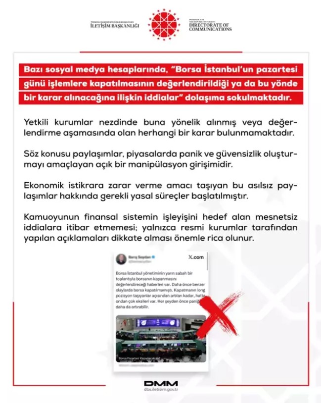 1 Mart 2026 Pazar günü öğleden sonra sosyal medyada yayılan “Borsa yönetiminin olağanüstü toplanacağı ve piyasaları kapatacağı” yönündeki söylentiler, yatırımcılar arasında kısa süreli bir endişeye yol açtı. Özellikle bazı ekonomistlerin ve anonim hesapların “paniği artırabilir” uyarılarıyla körüklenen bu iddialar üzerine harekete geçen DMM, bir açıklama yaparak piyasaların normal takviminde işlem görmeye devam edeceğini bildirdi. Yapılan açıklamada, bu tür paylaşımların “ekonomik istikrara zarar verme amacı taşıyan açık bir manipülasyon girişimi” olduğu vurgulanarak, vatandaşların yalnızca resmi kurumların beyanatlarına itibar etmesi gerektiği hatırlatıldı.