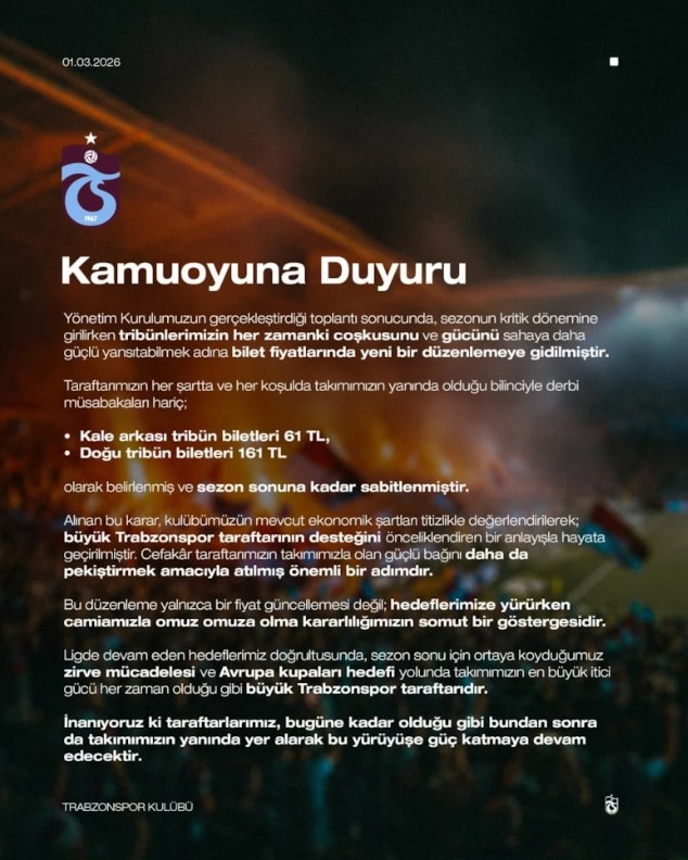 Bordo-mavili yönetim, bu hamle ile stadyumdaki boş koltukları doldurmayı ve iç saha maçlarında rakipler üzerinde baskı kuracak o eski “fırtına” atmosferini geri getirmeyi hedefliyor. Taraftarların bu jest sonrası satışa çıkacak ilk maç biletlerine yoğun ilgi göstermesi bekleniyor.